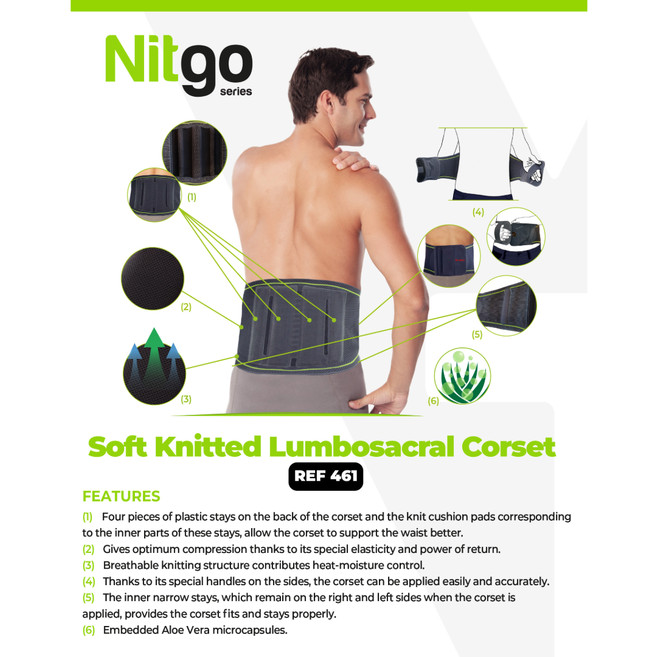 Corset lombosacral elastic, conceput pentru susținerea zonei lombare și sacro-lombare în caz de dureri ușoare sau moderate. Materialul elastic și respirabil permite purtarea confortabilă pe parcursul zilei, iar cele patru balene de susținere din partea dorsală ajută la menținerea unei poziții corecte a coloanei vertebrale. Reduce tensiunea musculară, stabilizează zona lombară și poate fi utilizat în activități cotidiene sau profesionale care suprasolicită spatele.