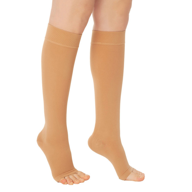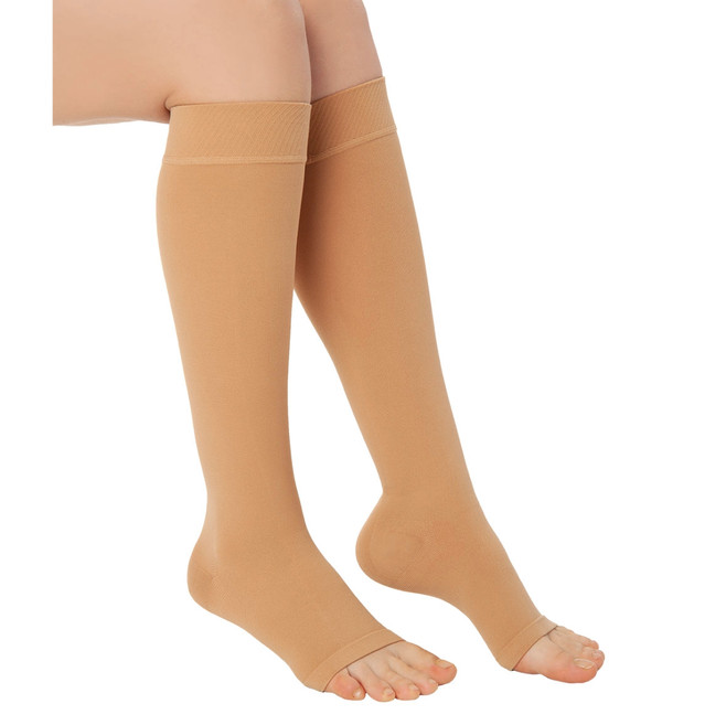 Компрессионные чулки до колена с открытым носком обеспечивают оптимальную поддержку и компрессию для улучшения кровообращения в нижних конечностях. Изготовлены из эластичных, дышащих материалов, обеспечивающих комфорт при длительном ношении