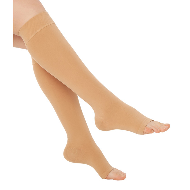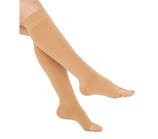 Șosetele compresive până la genunchi, cu vârf deschis, oferă o compresie gradată medical, îmbunătățind circulația venoasă și reducând simptomele insuficienței venoase cronice. Designul cu vârf deschis îmbunătățește confortul, în special pentru persoanele cu degete sensibile, deformări sau în perioadele postoperatorii.