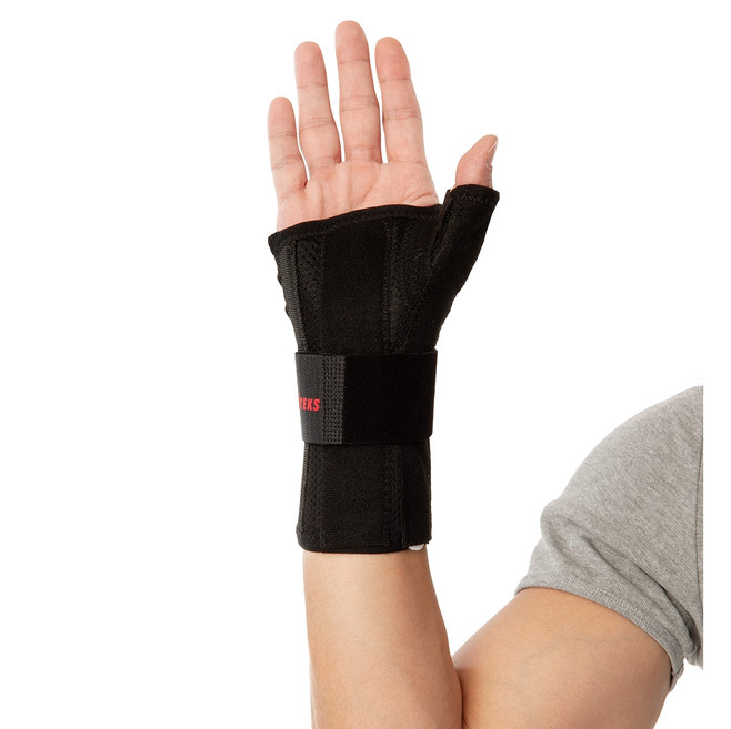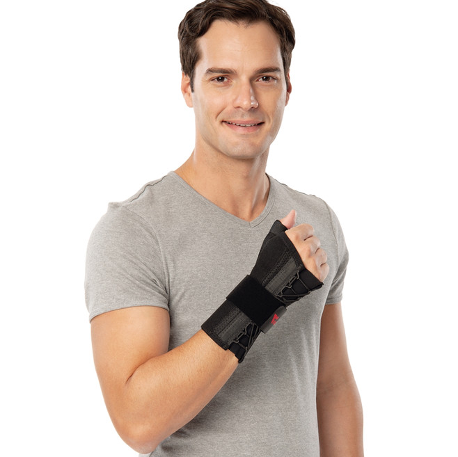 Ортез обеспечивает надежную фиксацию запястья и большого пальца, оснащён двумя алюминиевыми шинами – для запястья и для пальца. Рекомендуется при теносиновите, синдроме запястного канала и воспалительных процессах.Изготовлен из дышащей ткани, которая обеспечивает комфорт и оптимальную вентиляцию. Благодаря эластичным шнуркам и ремню ортез хорошо прилегает к руке и обеспечивает полную поддержку.Может использоваться как для правой, так и для левой руки.На изделии предусмотрены два канала с маркировкой «правая» и «левая», в которые вставляется металлическая шина в зависимости от стороны. Шина всегда должна находиться с внутренней стороны запястья.