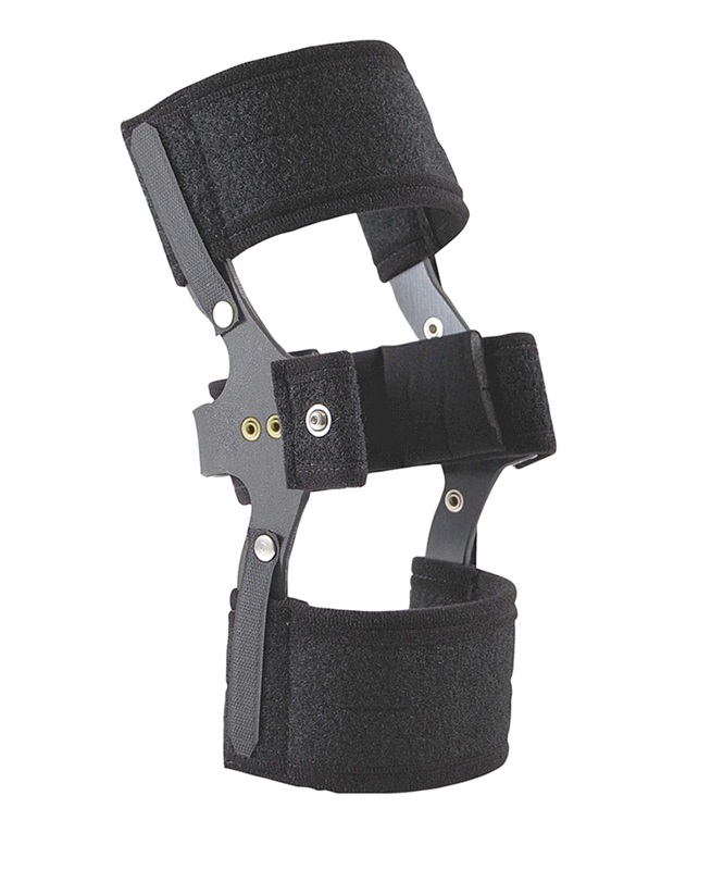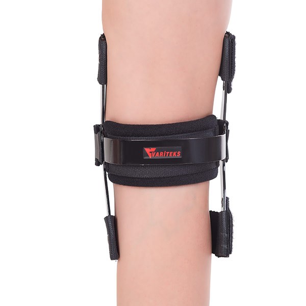 Orteză de genunchi dură din aluminiu, căptușită în interior în zona poplitee,închidere prin sistem velcro.
