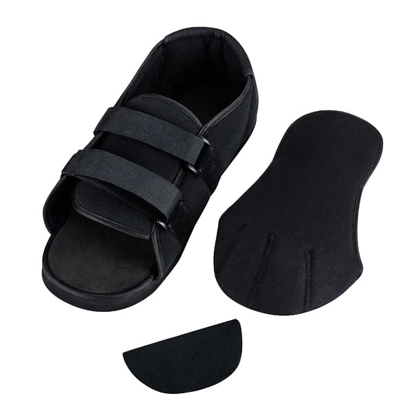 Pantof postoperator realizat din material respirabil și cu o construcție cu vârf deschis, ușor de încălțat. Întărirea rigidă în călcâi menține piciorul în poziția corectă, oferă un control al mișcării antepiciorului pentru vindecare postoperatorie corectă. Sistemul de prindere cu 2 benzi velcro permite o adaptare la picioarelor cu deformari sau bandaje postchirurgicale. Curelele velcro permit o fixare confortabilă. Poate fi adaptat atât pentru piciorul drept, cât și pentru piciorul stâng.